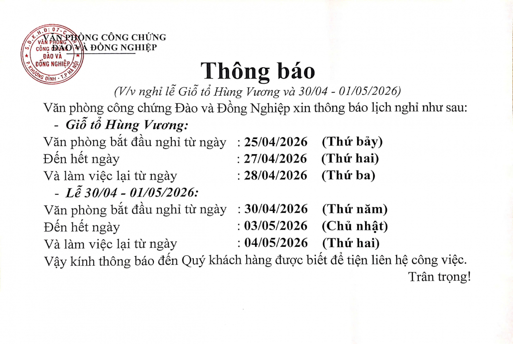 Tin TứcThông báo nghỉ Giỗ Tổ Hùng Vương và 30/4, 01/05 https://vanphongcongchung.vn/wp-content/uploads/2017/11/logo-DaoPartner.jpg 0 0 admin https://vanphongcongchung.vn/wp-content/uploads/2017/11/logo-DaoPartner.jpg admin2026-04-23 12:26:382026-04-23 12:27:02Thông báo nghỉ Giỗ Tổ Hùng Vương và 30/4, 01/05